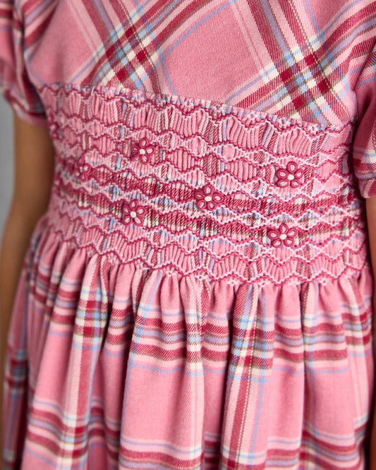MALVI & CO Vestito Tartan con punto Smock Lampone-Rosa-Azzurro