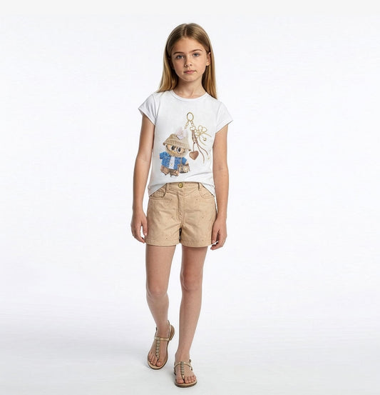 ELSY Girl Shorts Cotone Beige Ricamo Floreale Primavera-Estate