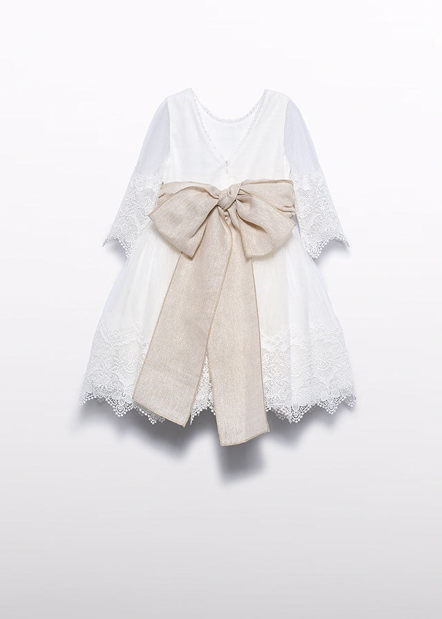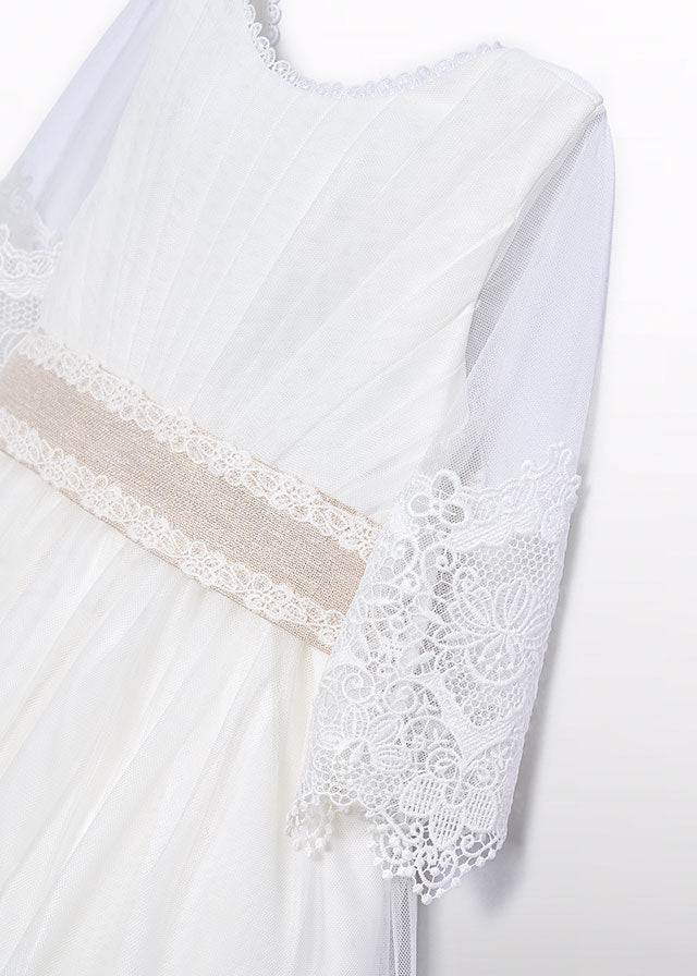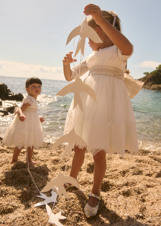 Elegante vestito cerimonia in morbido tulle con ricami in pizzo guipur color panna, manica a 3/4 con bordo ricamato in pizzo guipur e smerlo, corpetto plissettato, scollo rifinito in pizzo, ampia gonna con bordo e smerlo ricamato in pizzo guipur, scollatura sul retro, passanti in vita, fascia in tessuto sabbia-oro rifinita con bordi pizzo panna da annodare con fiocco sul retro, chiusura con zip sul retro, sottoveste bordata in tulle tono su tono.