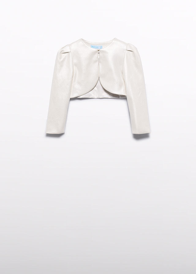 Bolero girl in ecopelle color perla, manica lunga a sbuffo, chiusura con gancetto e strass sul davanti, interamente foderato.