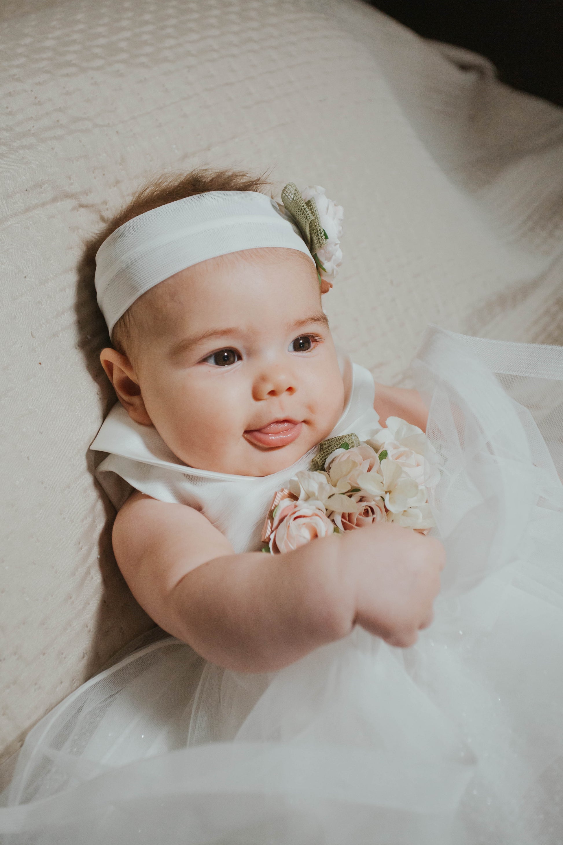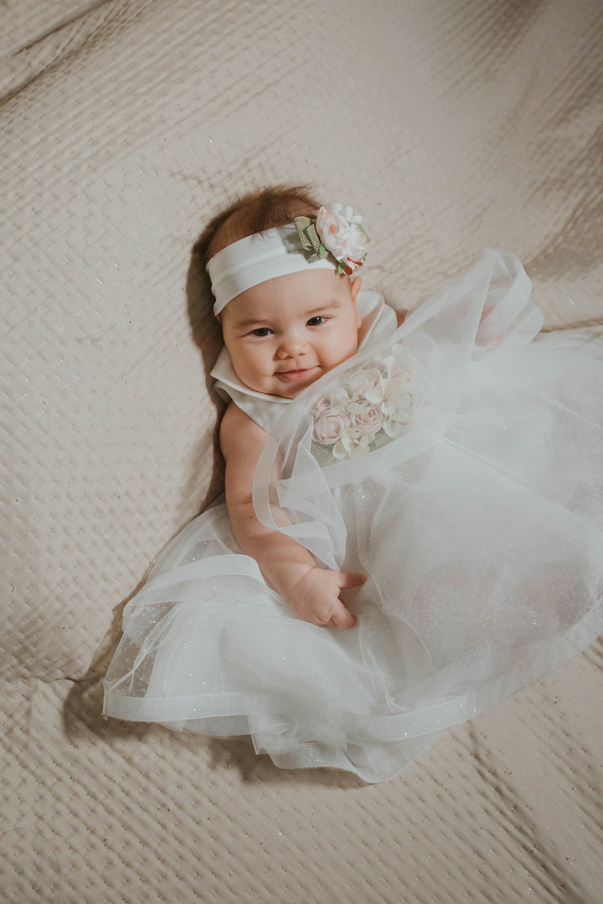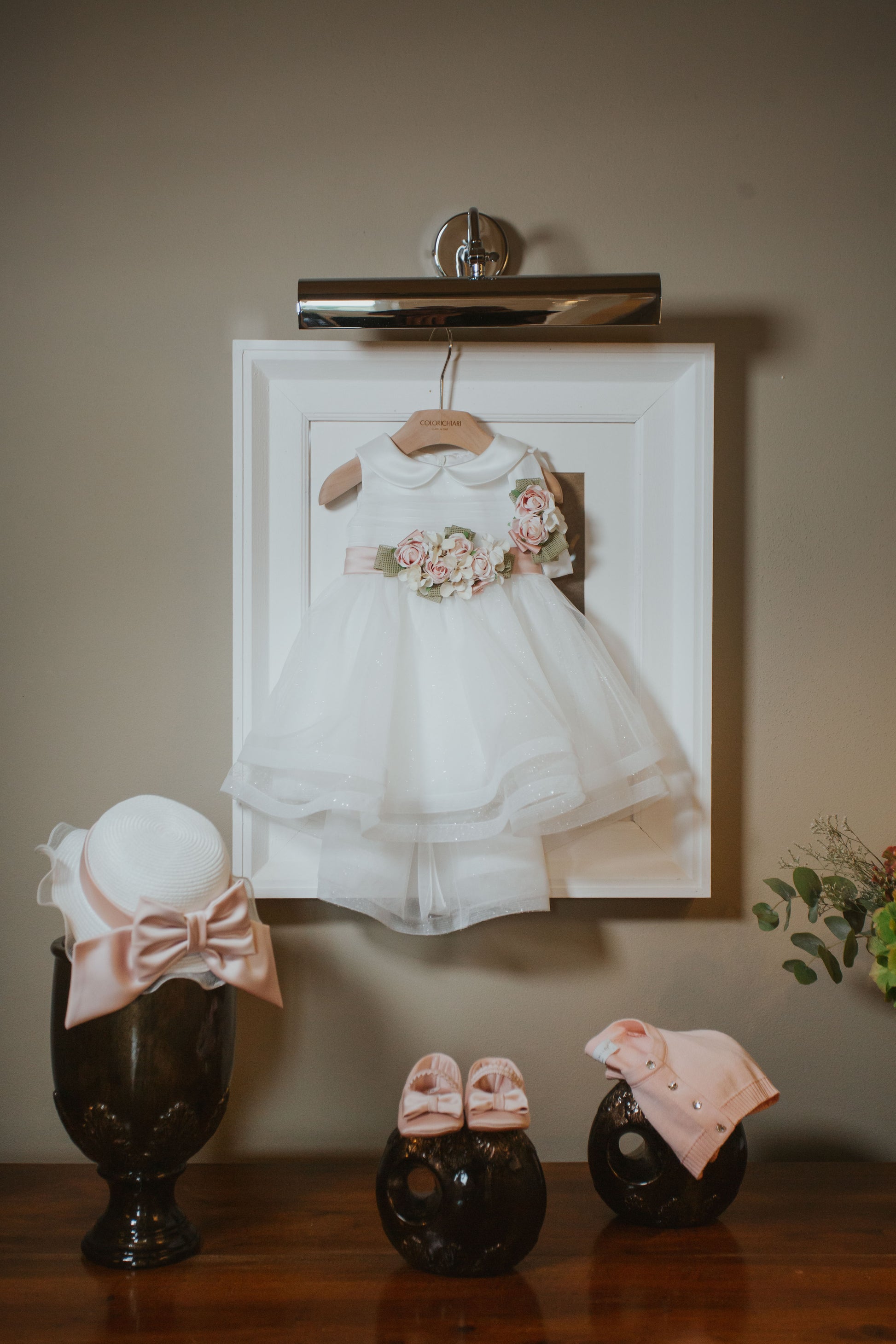 Elegante abitino cerimonia giromanica, colletto in raso, corpetto in tulle plissettato e glitterato, ampia gonna con coda in tulle glitterato bianco latte, passanti in vita, cinturino in raso con fiocco rosa antico e chiusura con bottoni sul retro, spilla con fiori rosa-panna e nastri verde-rosa sul davanti, chiusura con zip sul retro, con sottoveste.