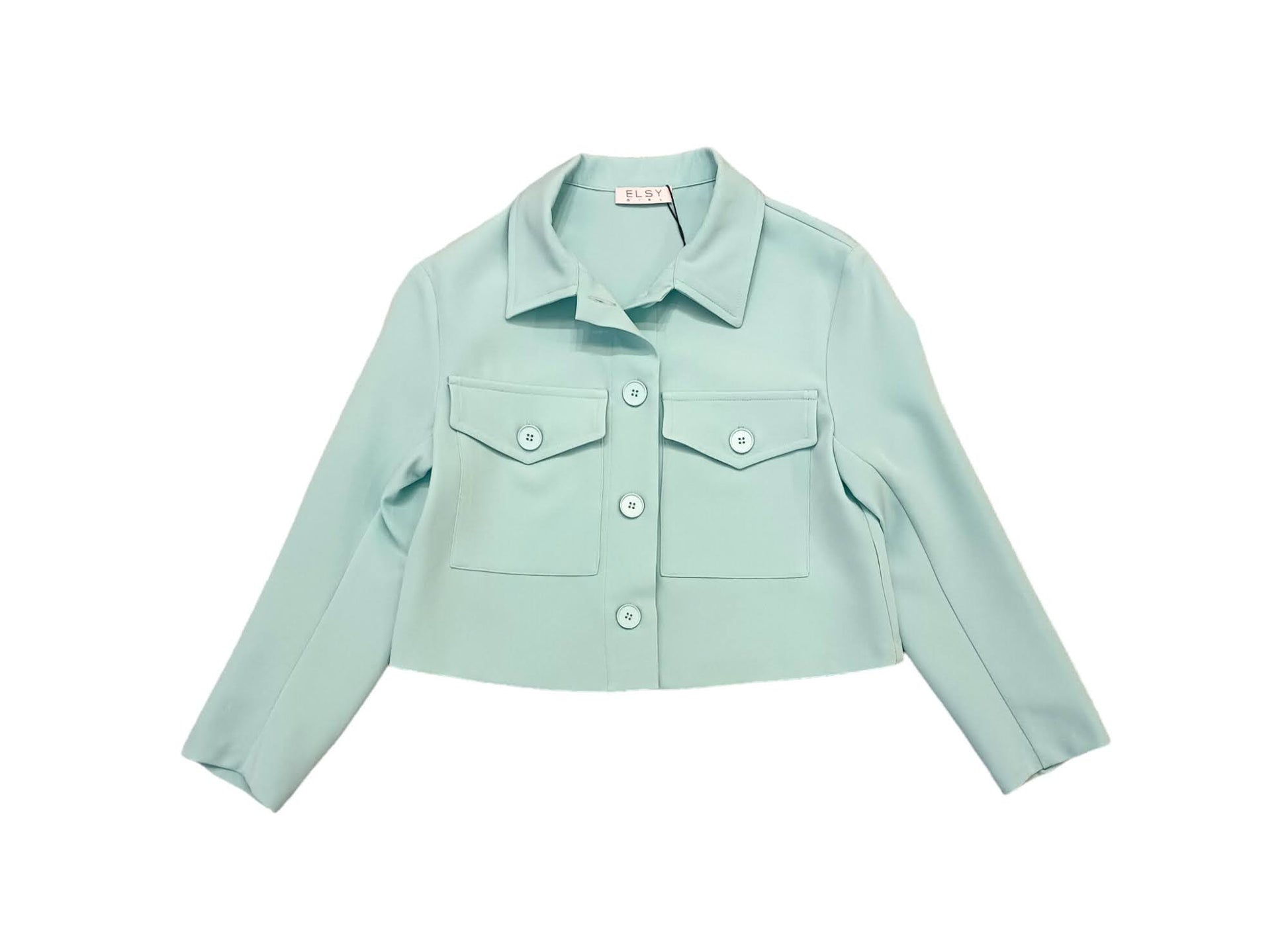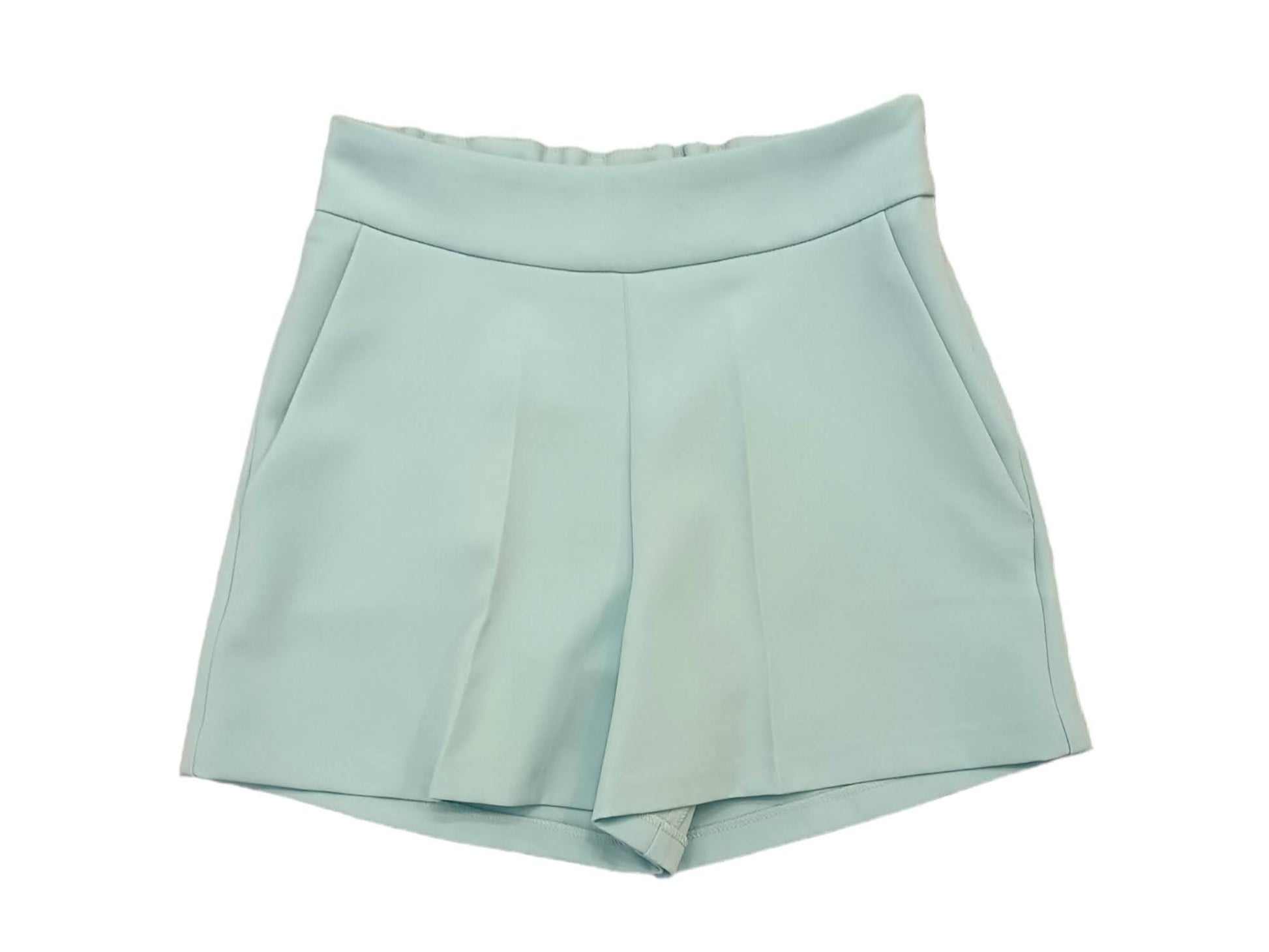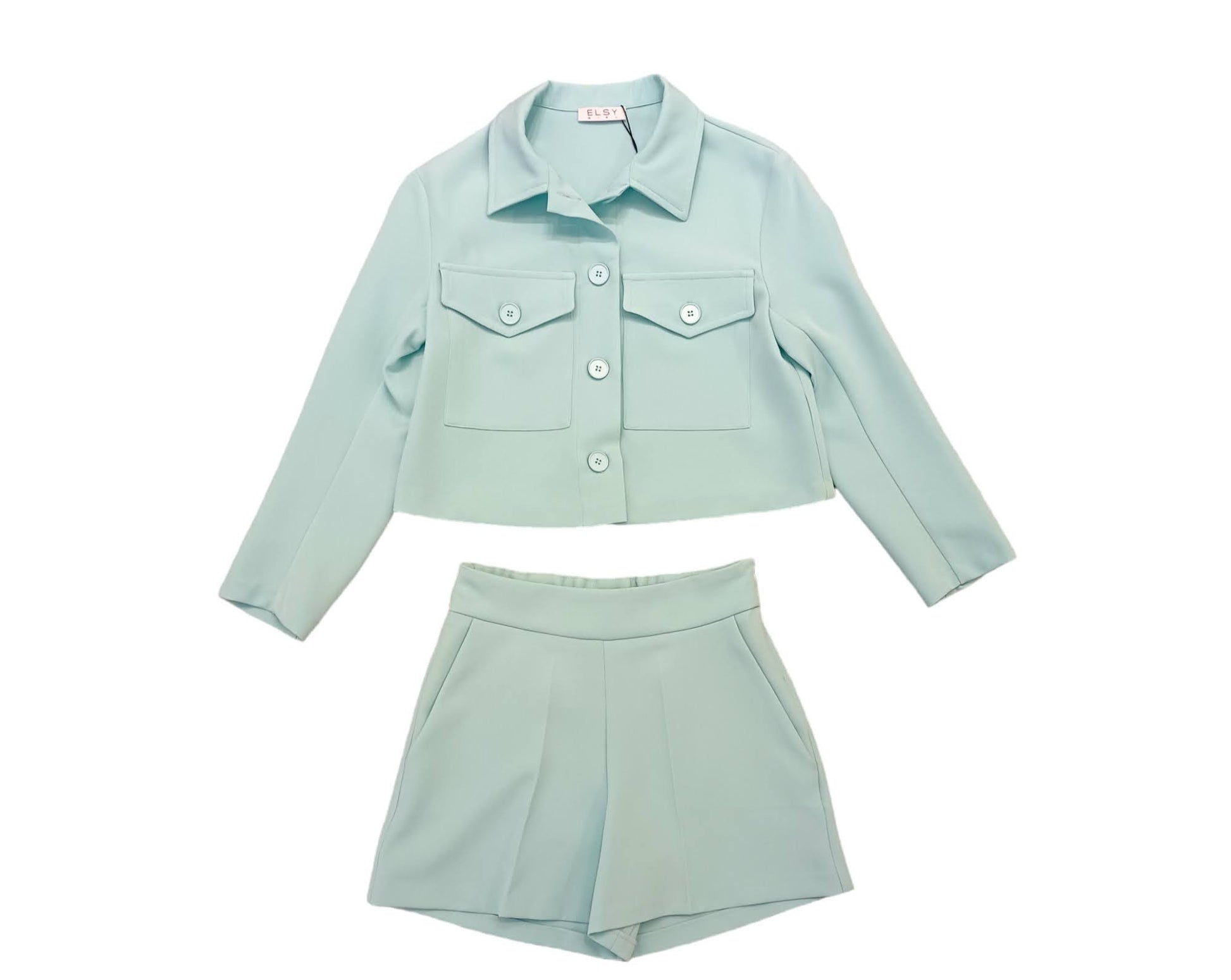 2-piece tiffany-colored formal suit: Saharan jacket, two large pockets with flap and button on the front; Shorts with welt pockets on the front, elastic waist on the back, side zip closure.