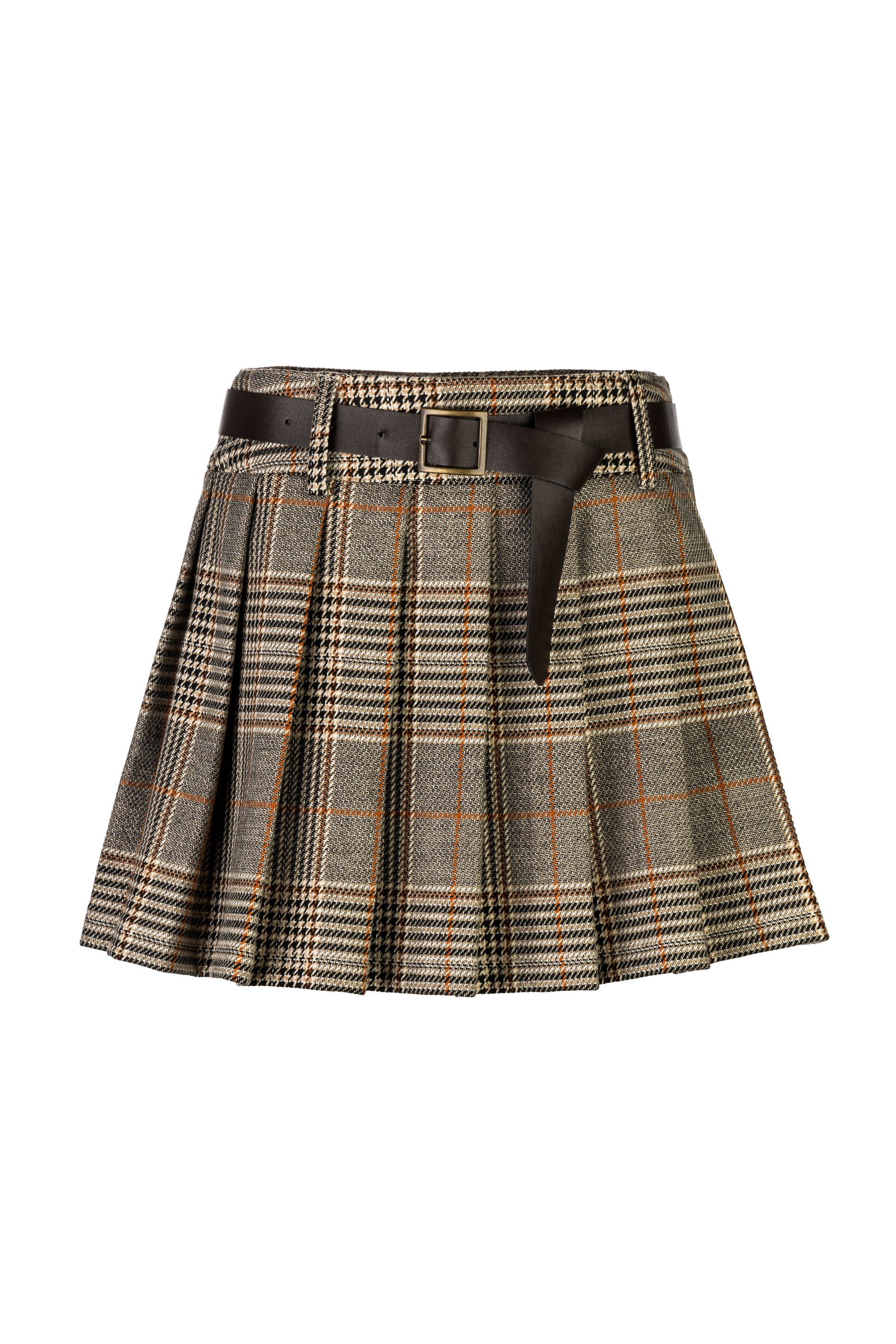 Gonna girl a pieghe fantasia Principe di Galles nei toni del marrone, passanti ed elastico regolabile in vita, cinturino in ecopelle testa di moro con fibbia in metallo bronzato, chiusura con zip laterale.