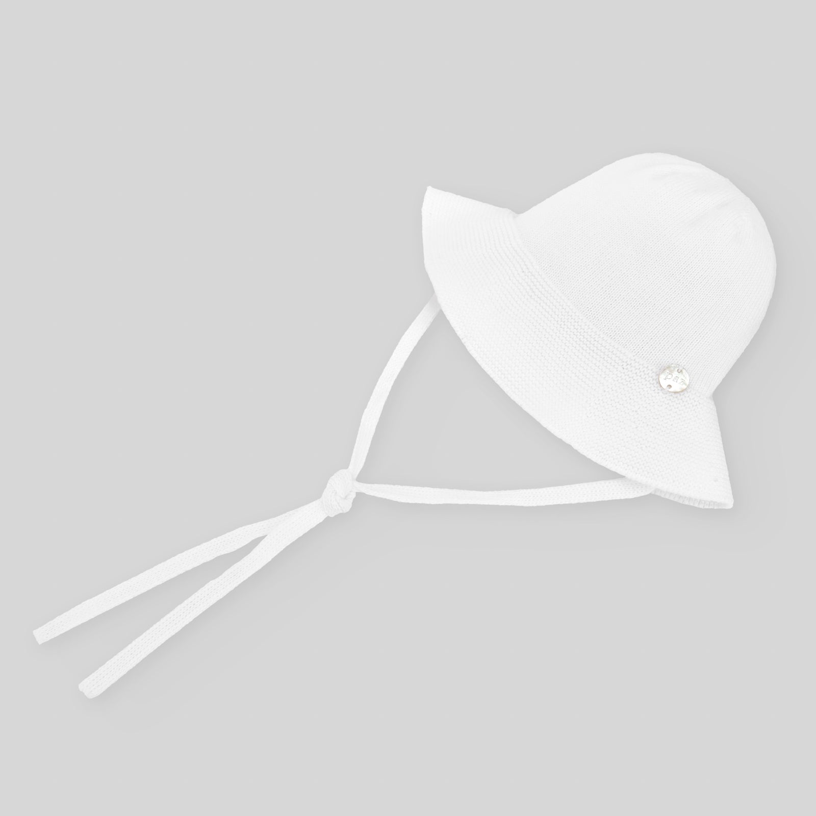 Cappellino modello alla pescatora lavorata a maglia in filo di cotone bianco, bottone logato in madreperla sul davanti, laccetti da annodare con fiocco.