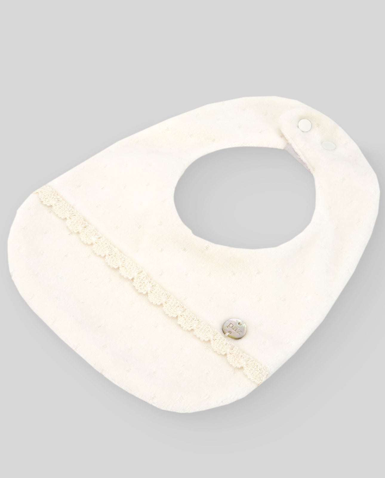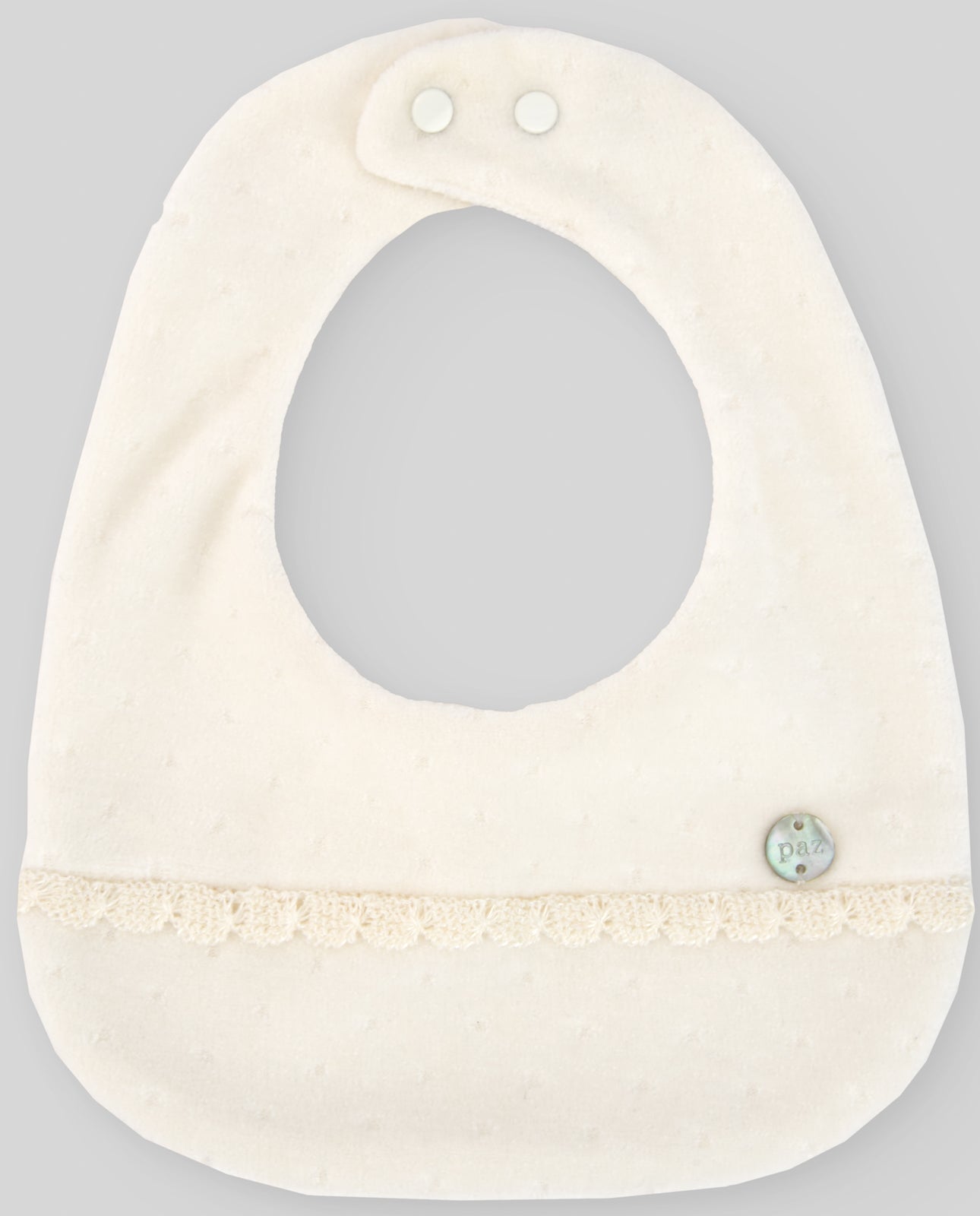Bavaglino in ciniglia panna con pizzo e bottone logato in madreperla tono su tono sul davanti, chiusura con bottoni a pressione.