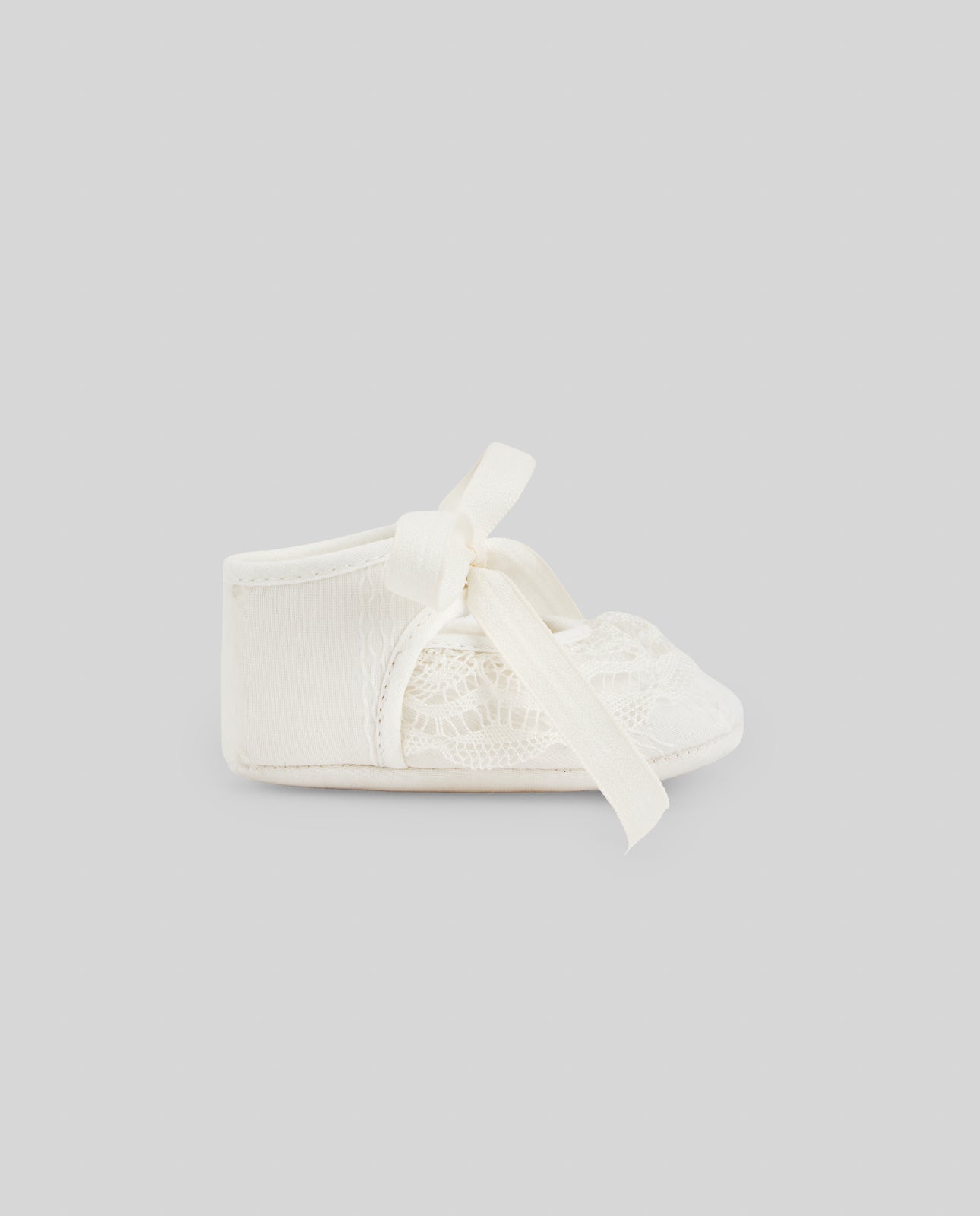 Elegante scarpina cerimonia in tessuto operato colore crema con bordo in pizzo tono su tono, laccetti in tessuto da annodare con fiocco sul davanti.