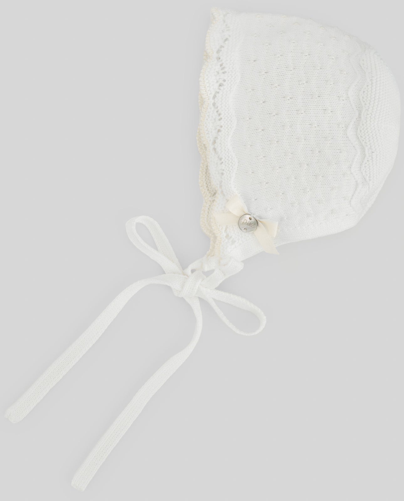 Cuffia in coordinato lavorata a maglia in filo di cotone panna, picot e smerlo al bordo color beige, fiocchetto decorativo in tessuto tono su tono con bottone logato in madreperla su un lato, laccetti da annodare con fiocco sul davanti.