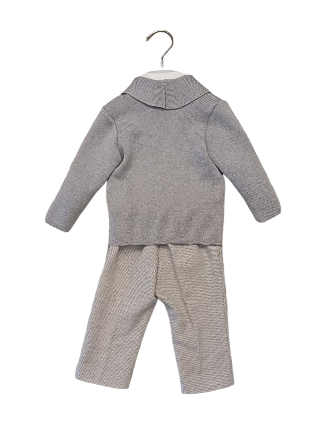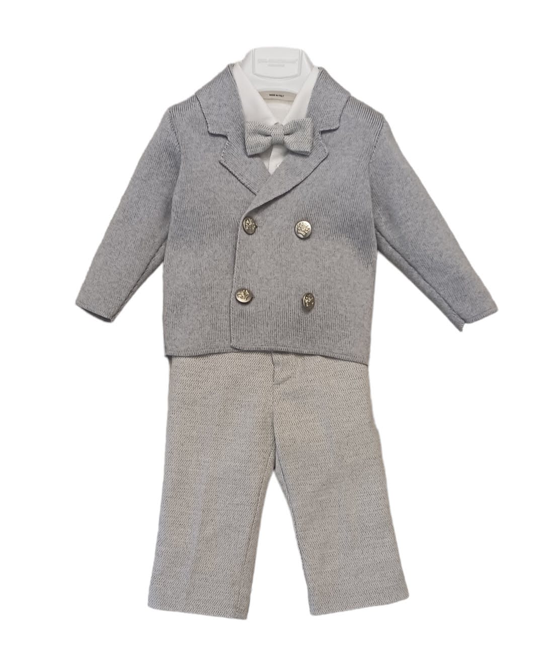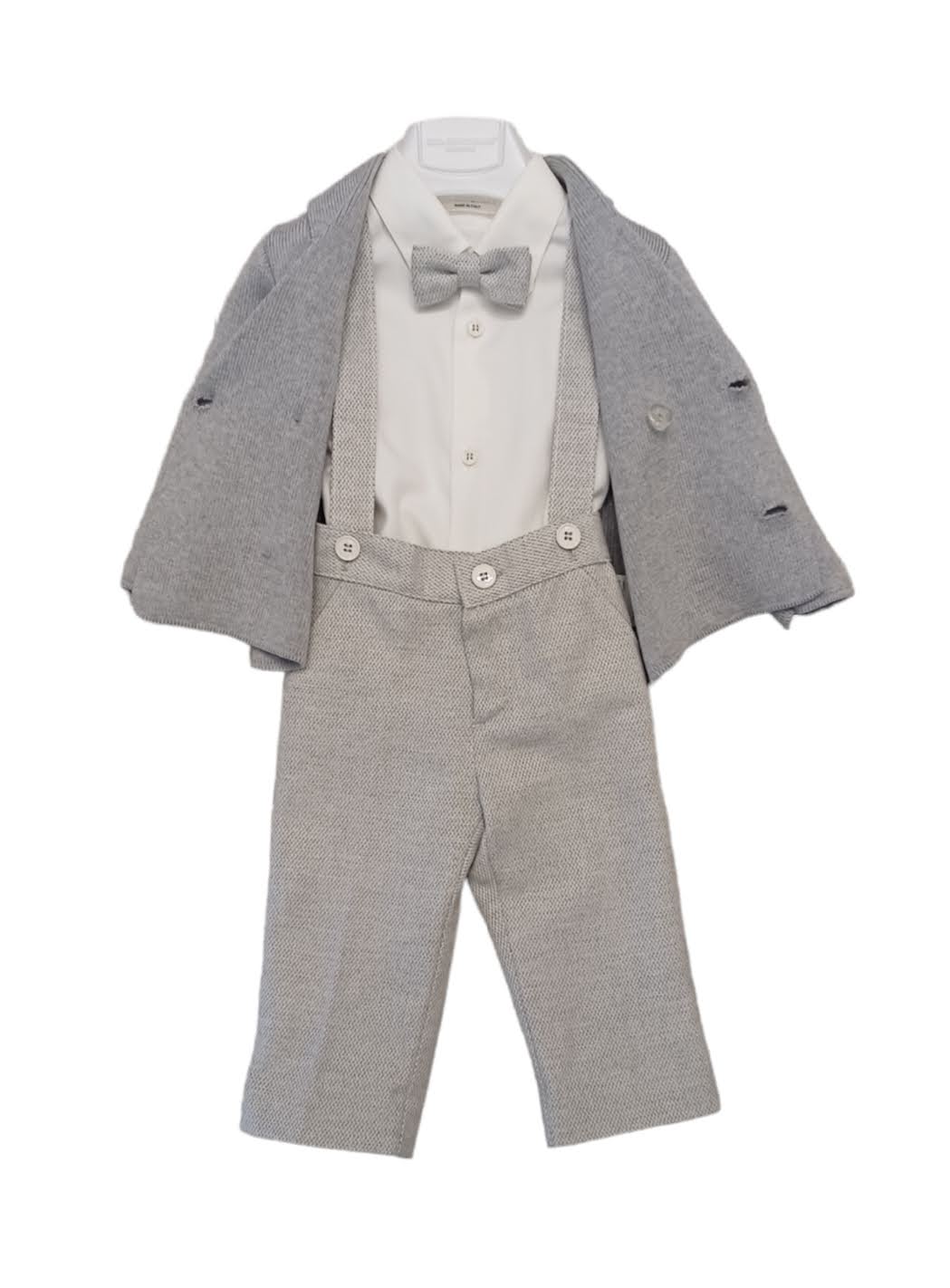 Elegante completo 4 pezzi: Cardigan doppiopetto in lana pettinata grigio perla con revers, chiusura con 4 bottoni in metallo argento con stemma; Camicia in flanella di cotone bianco; pantalone sale-pepe grigio perla con bretelle da fissare con bottoni, chiusura con bottone e zip sul davanti, tasche a filo, elastico in vita sul retro, interamente foderato; doppio papillon in tessuto sale-pepe grigio perla in coordinato regolabile.