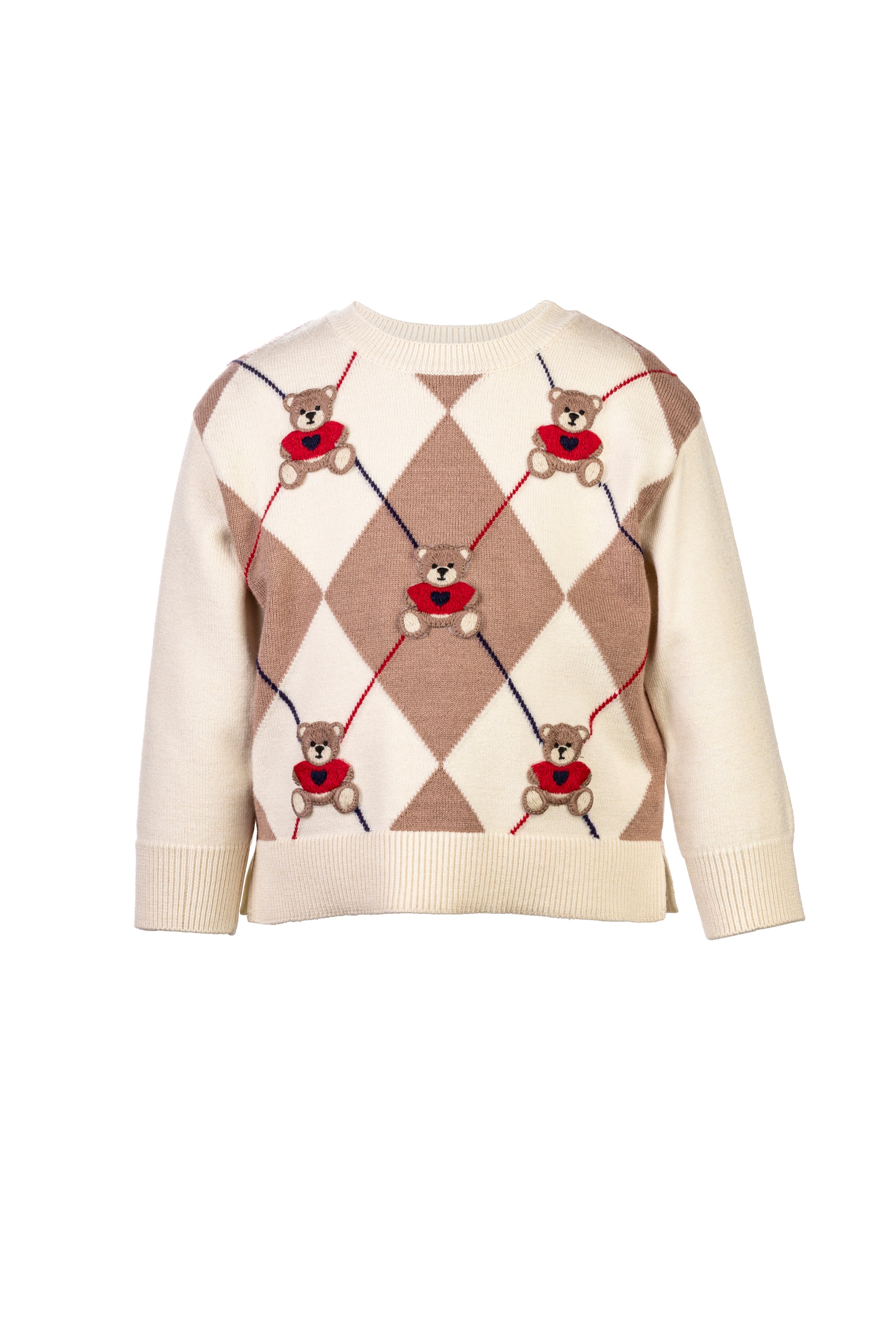 Morbida e calda maglia calata fantasia rombi color panna-cammello con orsetti a rilievo panna-cammello-rosso-blu sul davanti, tinta unita color panna sul retro e sulle maniche, girocollo.