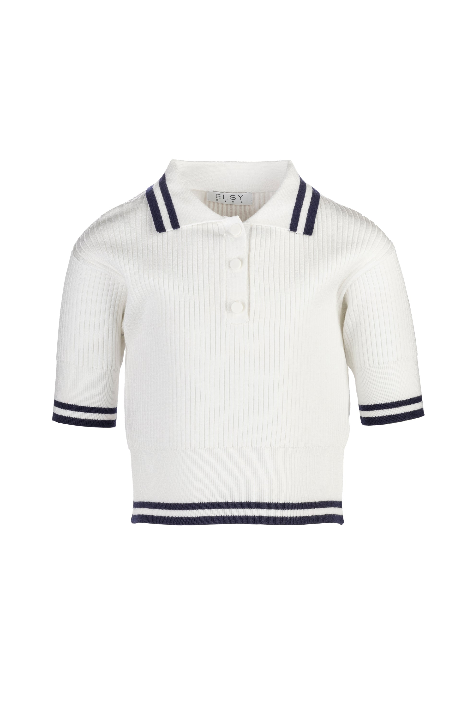 Maglia polo bianca a coste, manica corta, bordi con righe blu navy, chiusura con tre bottoni sul davanti.