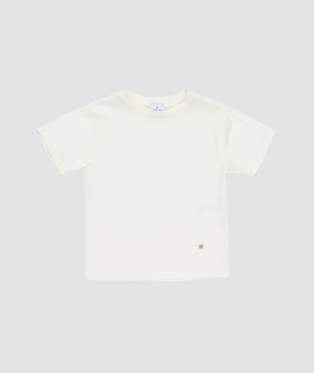 T-shirt boy in morbido cotone color gesso, girocollo in tessuto lavorato tono su tono, manica corta, logo ricamato a contrasto in basso sul davanti.