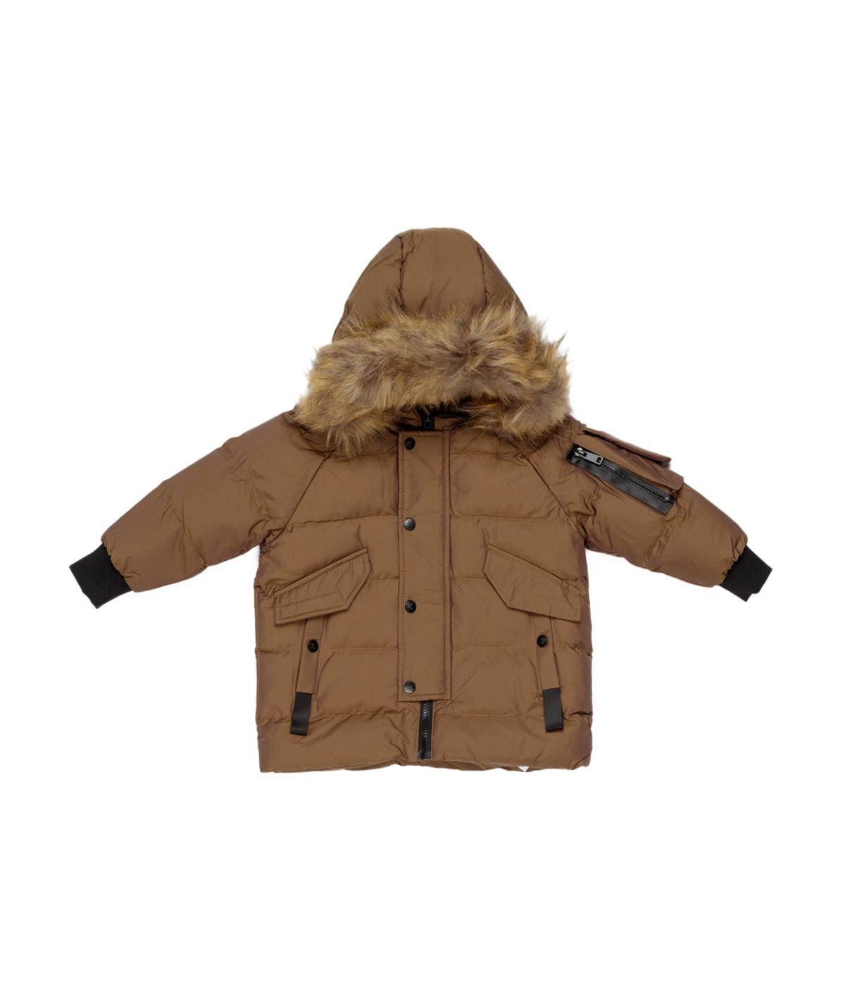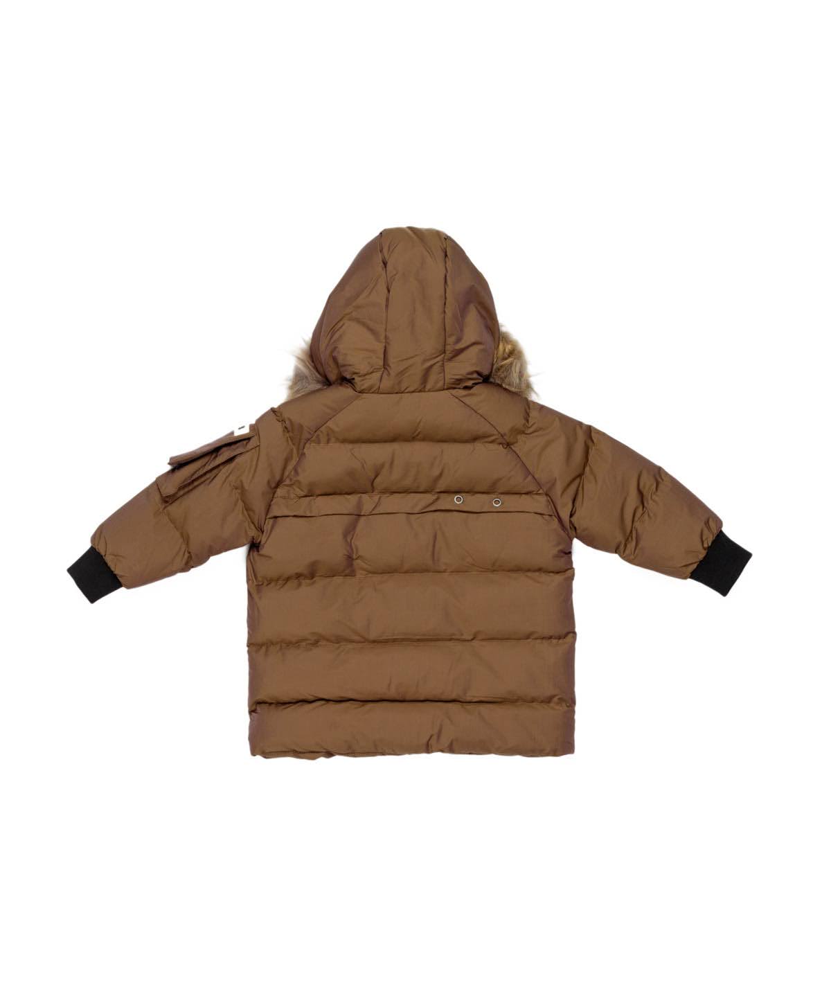 Giubbotto imbottito color cammello con cappuccio con bordo in ecopelliccia staccabile, tasche a filo con bottone logato a pressione e pattina sul davanti, taschino con zip e strappo su una manica, polsini, chiusura con zip e pattina con bottoni a pressione sul davanti.