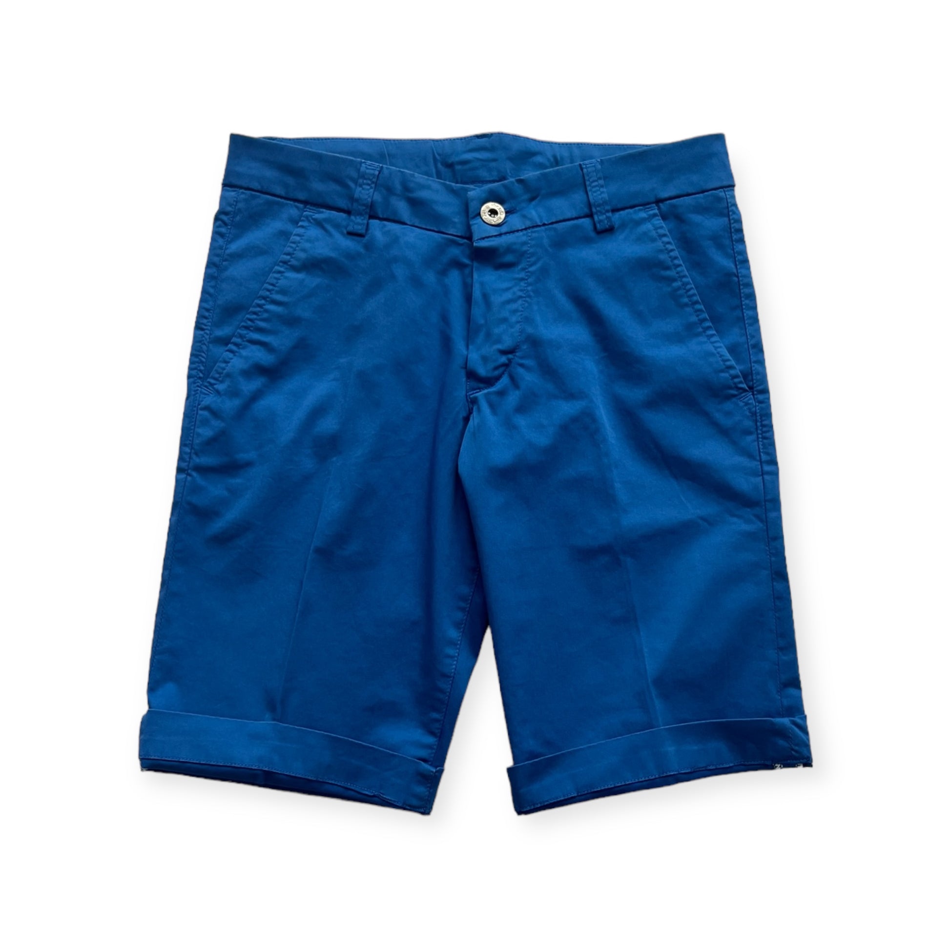 Bermuda boy in cotone color cobalto, tasche a filo sul davanti e sul retro, passanti e coulisse regolabile in vita, chiusura con bottone e zip sul davanti.