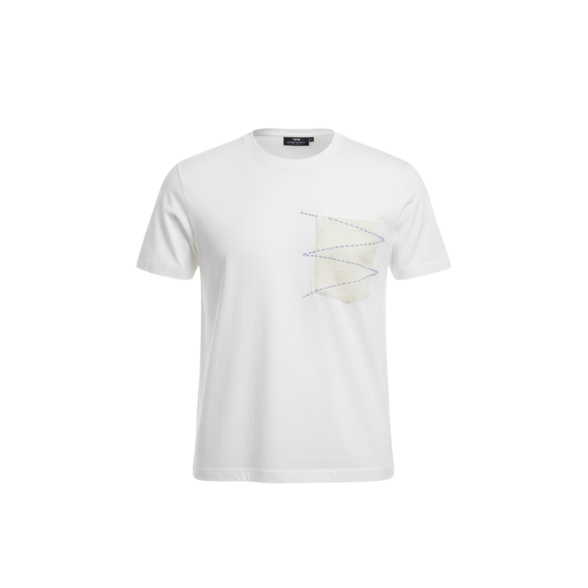 T-shirt boy girocollo in cotone bianco, manica corta, taschino in pizzo Sangallo tono su tono con impunture color cielo.