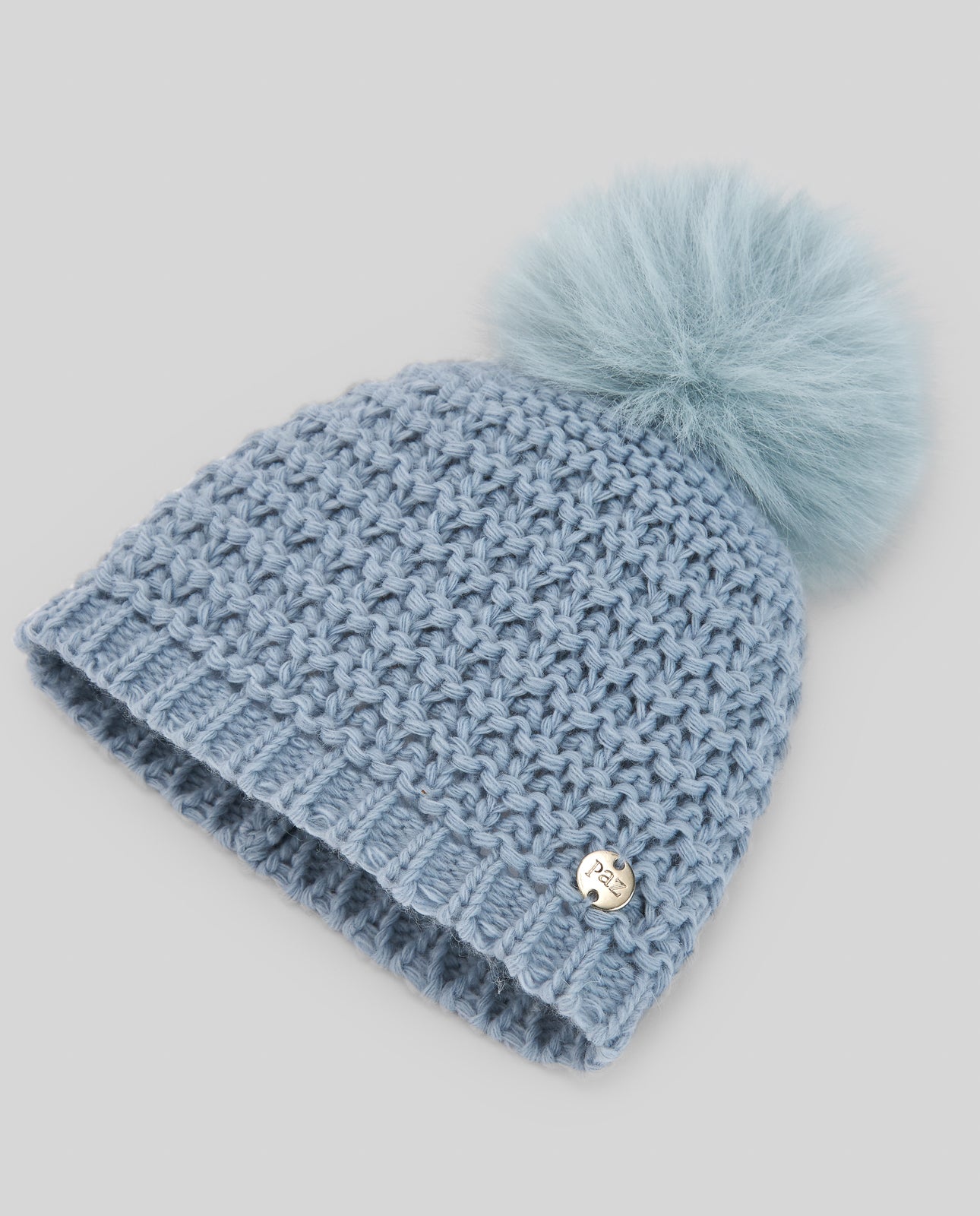Cappello lavorato a maglia azzurro polvere con pom pon in ecopelliccia tono su tono con bottone a pressione staccabile.