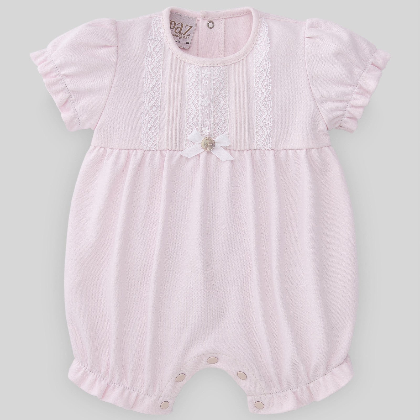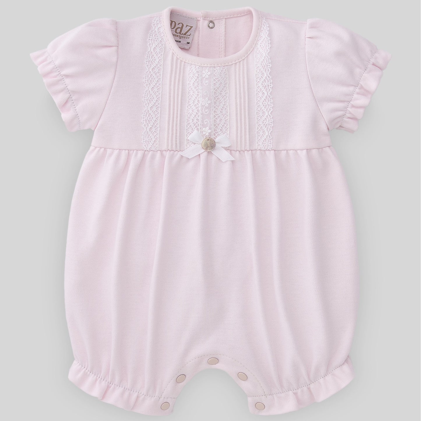 Pagliaccetto girocollo in cotone rosa, manica corta a sbuffo, pannello con pieghe piccole, inserti in pizzo e fiocchetto decorativo con bottone logato in madreperla sul davanti, chiusura con bottoni a pressione sul retro e al cavallo.