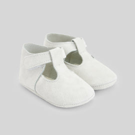 Scarpina baby in nabuk color bianco naturale con allacciatura laterale in velcro.