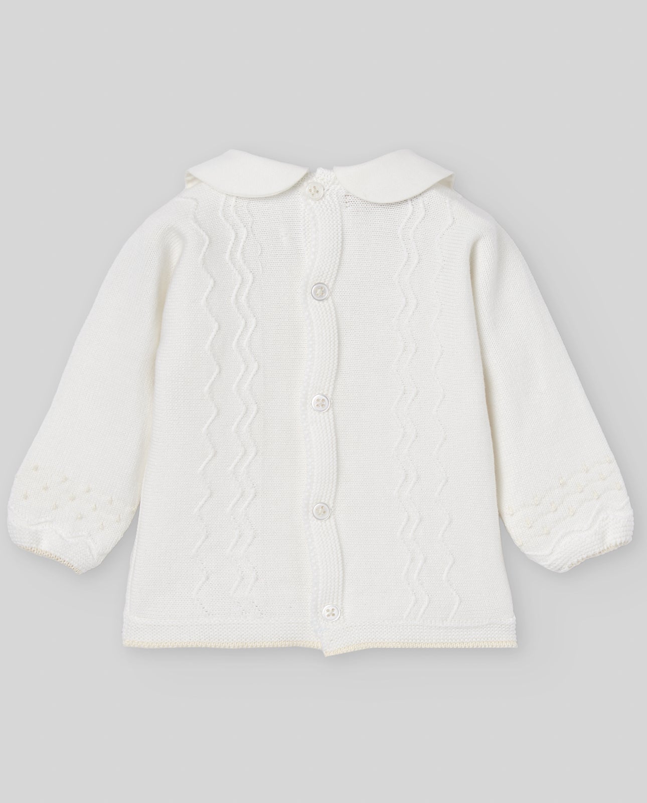 Maglia lavorata in filo di cotone panna, manica lunga, picot beige sul davanti e sui polsini, colletto in tessuto di cotone panna, bordi rifiniti in filo di cotone beige, bottoncini decorativi logati in madreperla sul davanti, chiusura con bottoni sul retro;