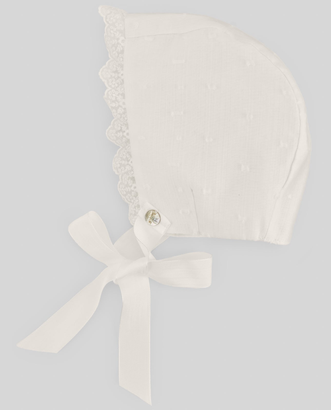 Cuffia in coordinato in organza plumetis, rifinita in tulle e pizzo smerlato sul davanti, nastro in tessuto da annodare con fiocco sul davanti, interamente foderata.