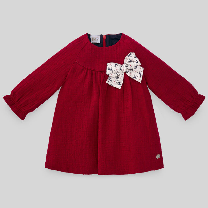Vestito in tesssuto goffrato plumetis rosso Persia, girocollo, manica lunga, fiocco decorativo fantasia renne bianco-rosso-blu, arricciatura sul davanti e sui polsini, interamente foderato, chiusura con zip sul retro.