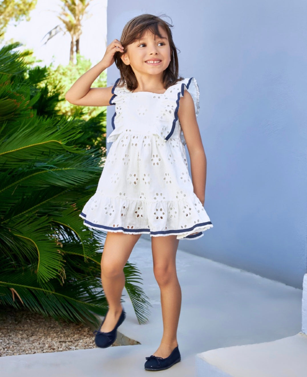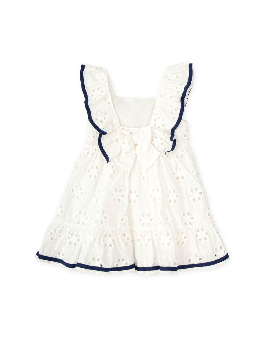 Abito smanicato in pizzo Sangallo cotone-lino bianco con rifiniture blu navy, rouges sul davanti e sul retro, fiocchetto decorativo sul retro, chiusura con zip laterale con sottoveste.