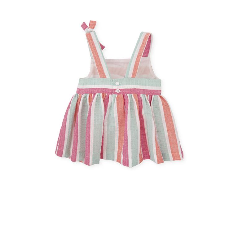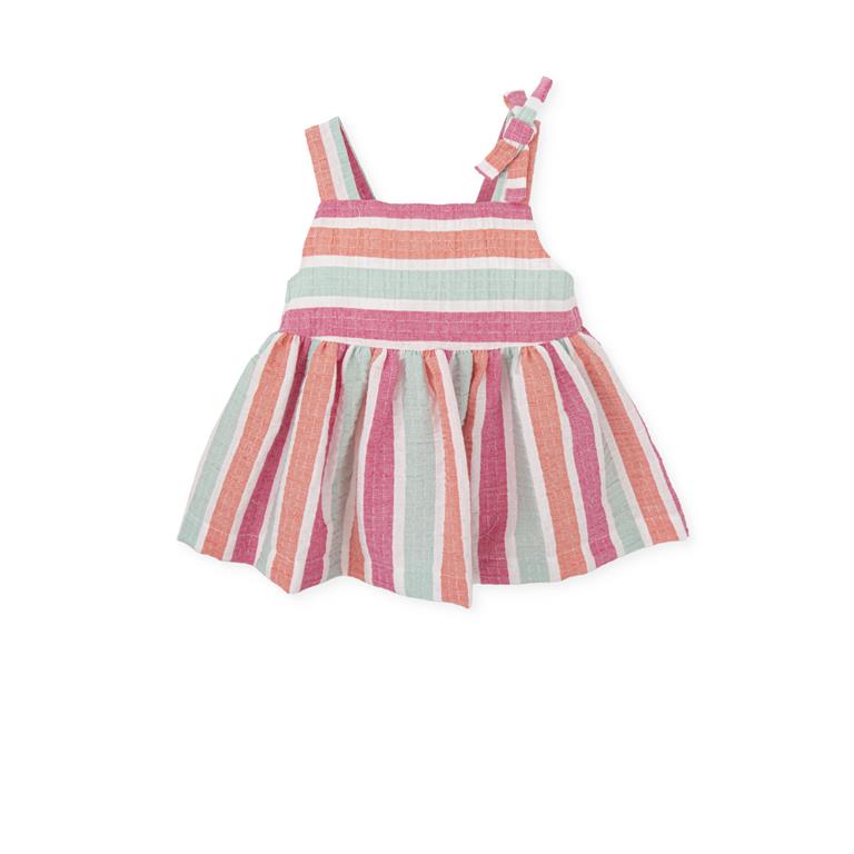 Completo 2 pezzi: Top in tessuto fantasia righe multicolore fucsia-verde acqua-bianco-arancio con bretelle e fiocchetto decorativo sul davanti, chiusura con bottoni sul retro, fodera; Pantalone Capri in misto lino verde acqua, tasche a filo e pences sul davanti, coulisse regolabile in vita, chiusura laterale con zip.