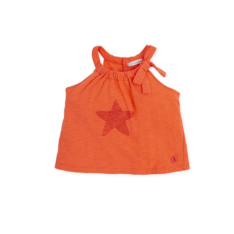 Top in cotone color corallo, fiocchetto decorativo e stella glitterata sul davanti, chiusura con bottoni a pressione sul retro.